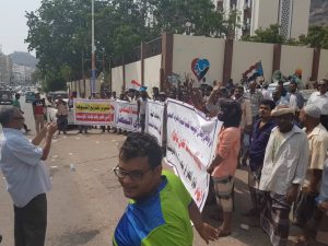 لليوم الثاني على التوالي _ موظفو المياه والصرف الصحي يتظاهرون لاقالة الإخواني فتحي السقاف المتورط بقضايا فساد والمطالبة بعودة علوي المحضار