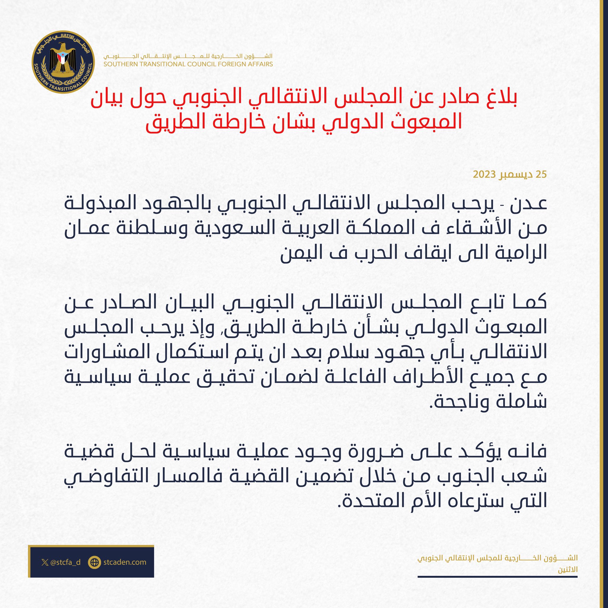 بلاغ صادر عن المجلس الانتقالي الجنوبي حول بيان المبعوث الدولي بشأن خارطة الطريق.