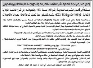 إعلان صادر عن لجنة التصفية لشركة الأمناء للصرافة والتحويلات المالية للدائنين والمدينين