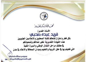 بكل فخر واعتزاز تمنحكم نقابة الصحفيين والإعلاميين الجنوبيين هذه الشهادة التقديرية نظير نضالكم وتضحياتكم في مختلف مراحل النضال الوطني والسيرة النقية التي تحليتم بها في حقل التربية والتعليم وميدان الصحافة والاعلام في عدن”.