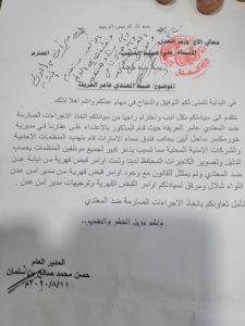 وطالب أكثر من عشرة تجار الأسبوع المنصرم في مذكرة لمحافظ ومدير أمن عدن يناشدون من خلالها حماية أرواحهم وأملاكهم من اعتداءات المدعو العريفة، الذي يحاول أن يبسط بقوة السلاح على أراضيهم.