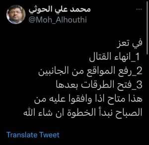 من جانبه قال الرافضي ( محمد الحوثي ) في تغريدة له على تويتر بأنه في تعز