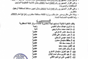 ونص الأمر الإداري الذي جاء بناءً على مقترح مدير عام مكتب وزارة الثقافة بالمحافظة، على تشكيل لجنة تحضيرية برئاسة الدكتور/ نوح عبد الله العليمي والدكتور أحمد محمد تربهي نائباً للرئيس ، بالإضافة إلى تعيين (11) عضواً يعملون على الإعداد والتحضير لإنشاء مركز يعنى ويهتم باللغة السقطرية والحفاظ عليها وحمايتها من الإندثار والتشويه.