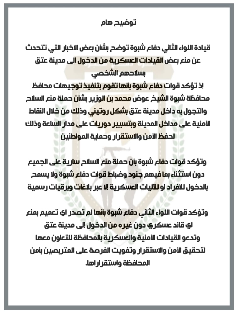 قيادة اللواء الثاني دفاع شبوة توضح بشان بعض الاخبار التي تتحدث عن منع بعض القيادات العسكرية من الدخول الى مدينة عتق بسلاحهم الشخصي.