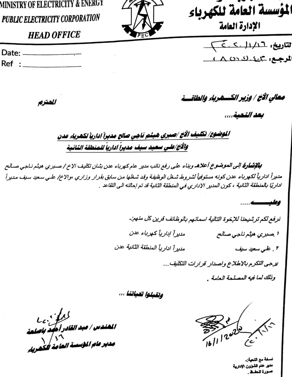 ويقول القرار الموجه لوزير الكهرباء السابق، الاخواني محمد العناني والموجه من قبل باصلعة، مديرعام المؤسسة العامة للكهرباء بأنه بناء على رفع نائب مدير عام المؤسسة عدن بشأن تكليف صبري هيثم ناجي صالح، مديرا اداريا لكهرباء عدن كونه مستوفيا لشروط شغل الوظيفة وقد شغلها من سابق بقرار وزاري.