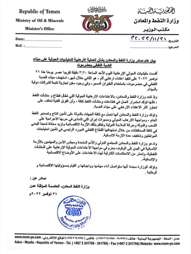 إن وزارة النفط والمعادن وكافة وحداتها والعاملين فيها وكافة أبناء شعبنا اليمني الأبي الصابر؛ تدعو المجتمع الدولي والأمم المتحدة ومنظمات حقوق الإنسان إلى الوقوف بحزم جراء تداعيات ومخاطر الهجمات الإرهابية للمليشيات الحوثية على المنشآت النفطية، ونحذر من انعكاسات ذلك على الأوضاع الاقتصادية والإنسانية، خصوصًا ونحن أمام جماعة مارقة عن النظام والقانون، ولا تؤمن بالسلامة الملاحية والجوانب الإنسانية والمواثيق الدولية.