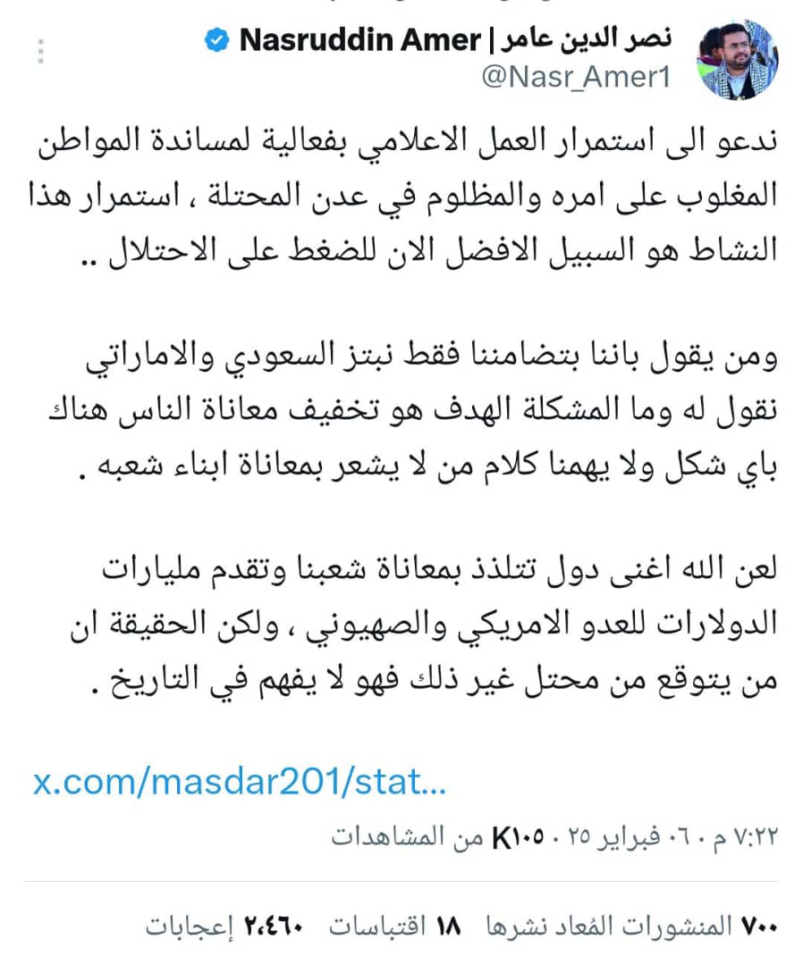 وفي هذا السياق، ظهر القيادي الحوثي نصر الدين عامر، نائب رئيس الهيئة الإعلامية لمليشيات الحوثي، محرضًا على الأحداث التي تشهدها عدن. في تغريدة له عبر حسابه الرسمي على منصة “إكس”، دعا جميع وسائل الإعلام التابعة للحوثيين إلى الاستمرار في تحريك الرأي العام في عدن، قائلًا: “استمرار هذا النشاط هو السبيل الأفضل الآن للضغط على الاحتلال”. وأضاف: “من يقول إننا بتضامننا فقط نبتز السعودي والإماراتي نقول له وما المشكلة؟ الهدف هو تخفيف معاناة الناس هناك بأي شكل ولا يهمنا كلام من لا يشعر بمعاناة أبناء شعبه”. وتابع قائلاً: “لعن الله أغنى دول تتلذذ بمعاناة شعبنا وتقدم مليارات الدولارات للعدو الأمريكي والصهيوني”.