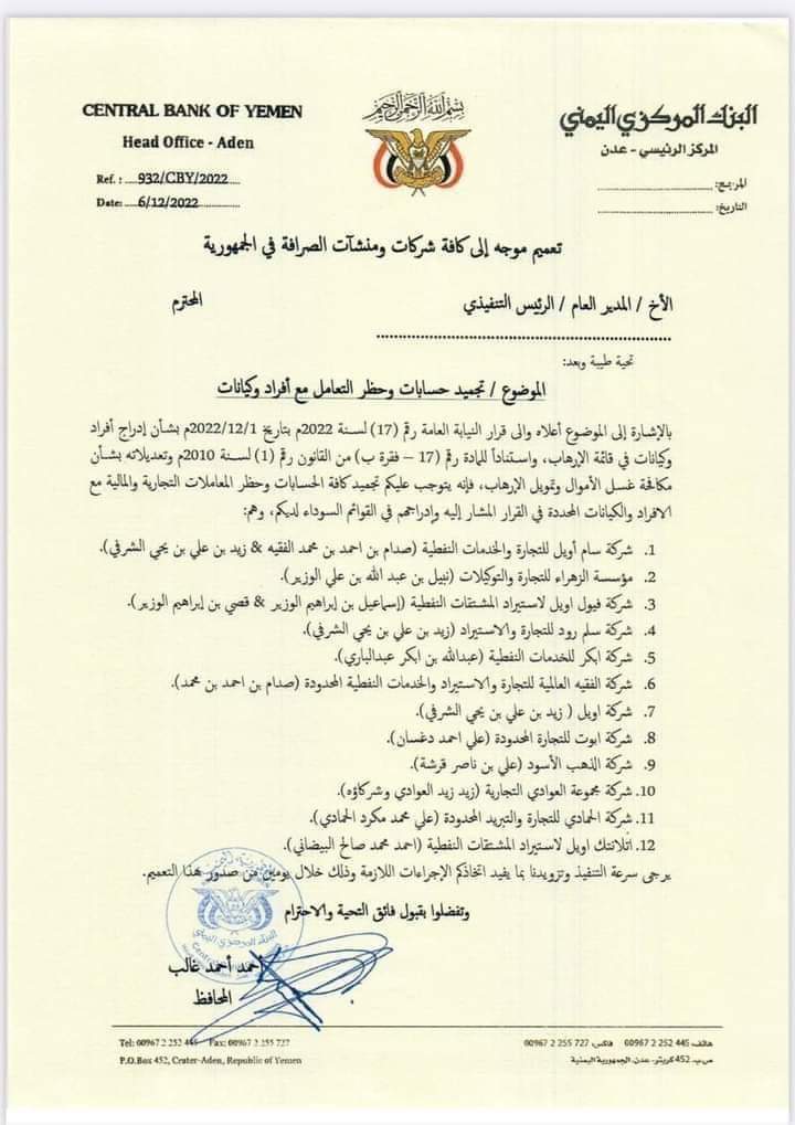 وحسب التعميم الذي أطلع عليه محرر عدن تايم، فقد أقر البنك تجميد حسابات وحظر التعامل مع الأفراد والكيانات التالي :-