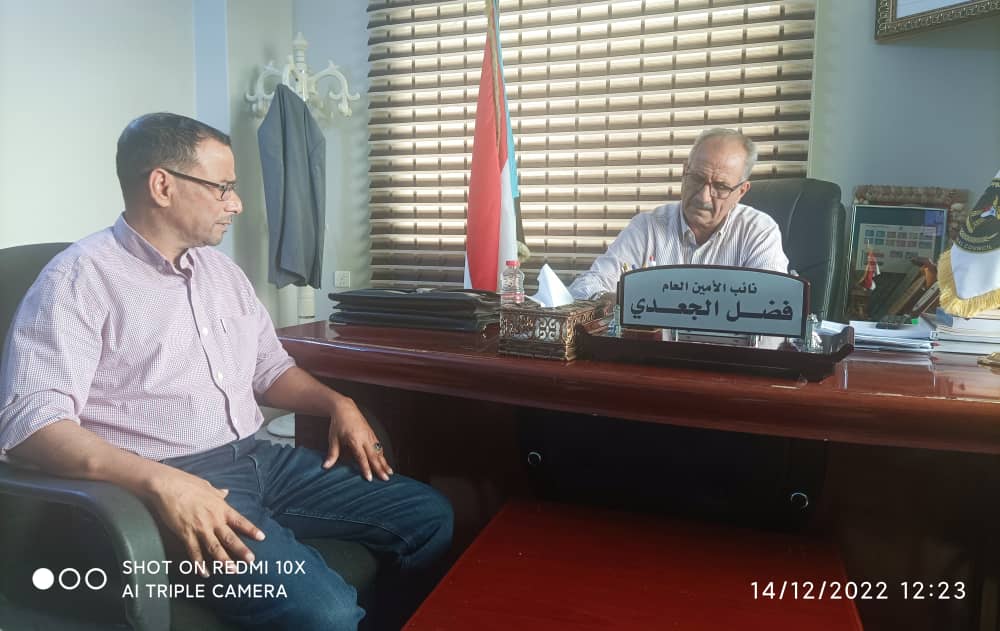 استقبل الاستاذ /فضل محمد حسين الجعدي، عضو هيئة رئاسة المجلس الانتقالي الجنوبي، نائب الامين العام للامانة العامة لهيئة رئاسة المجلس، استقبل الاستاذ/ محمد ناصر الساحمي، مدير مكتب الادارة الخارجية للمجلس الانتقالي الجنوبي في بريطانيا، صباح اليوم الاربعاء الموافق 14ديسمبر 2022م بمكتبه الكائن بالتواهي.