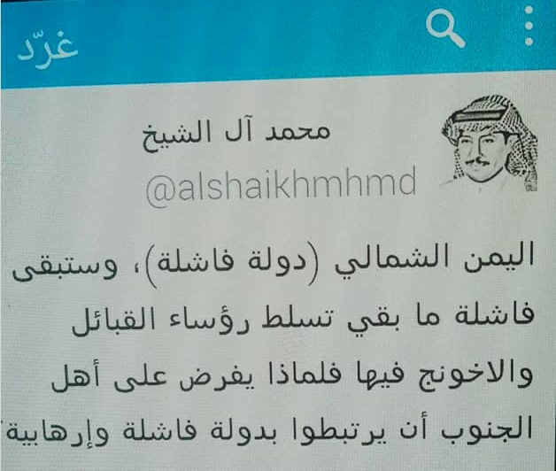 قال الكاتب السعودي محمد آل الشيخ من خلال تغريدة له بأن اليمن الشمالي دولة فاشلة وستبقى فاشلة.