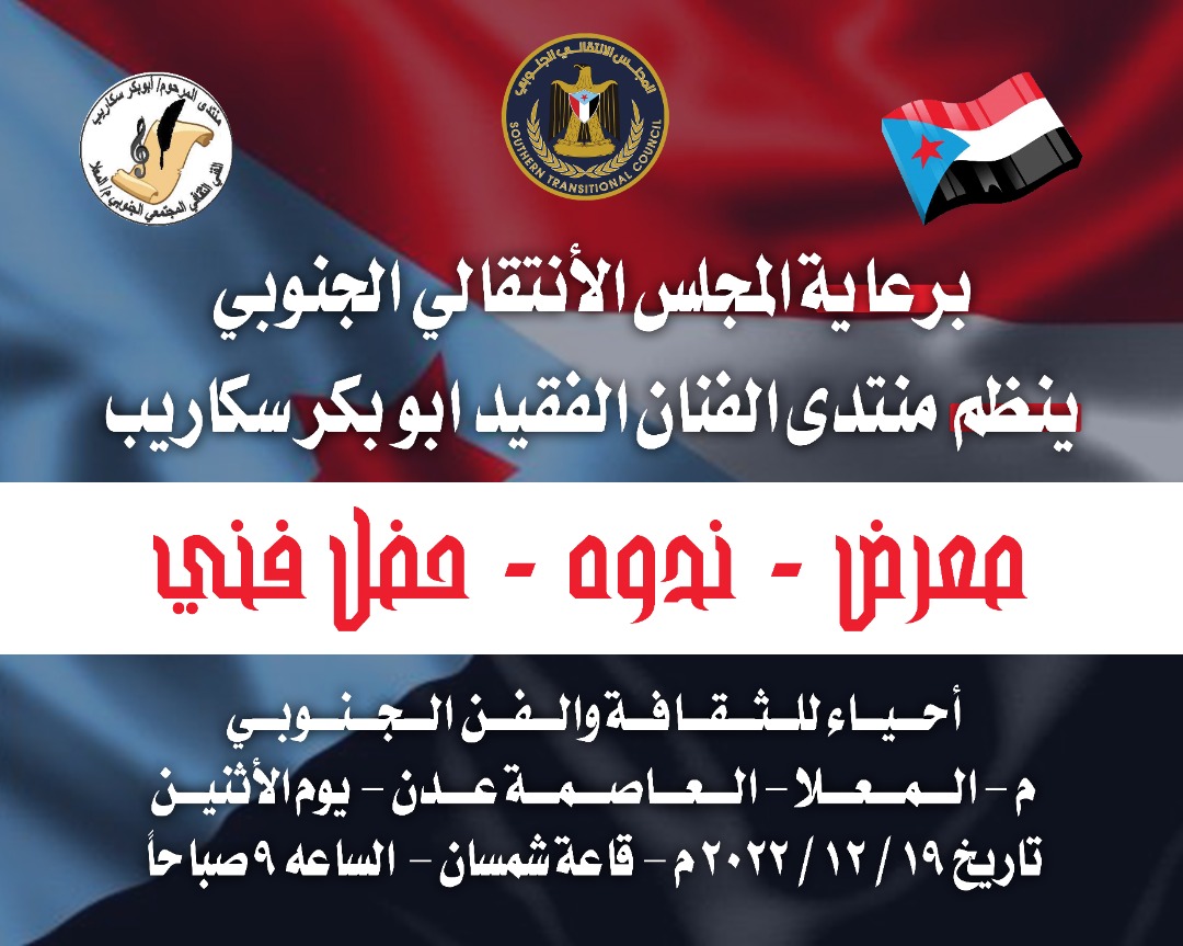 برعاية المجلس الانتقالي الجنوبي قرر منتدى الفنان الفقيد ابوبكر سكاريب الفني والثقافي المجتمعي اقامت الحفل الفني والندوة الخاصة عن حياة الفنان ومسيرته الفنية والثفافية ومعرض تشكيلي لذوي الاحتياجات الخاصة وذلك صباح يوم الاثنين القادم والموافق 19ديسمبر2022م في قاعة شمسان بالمعلاء.