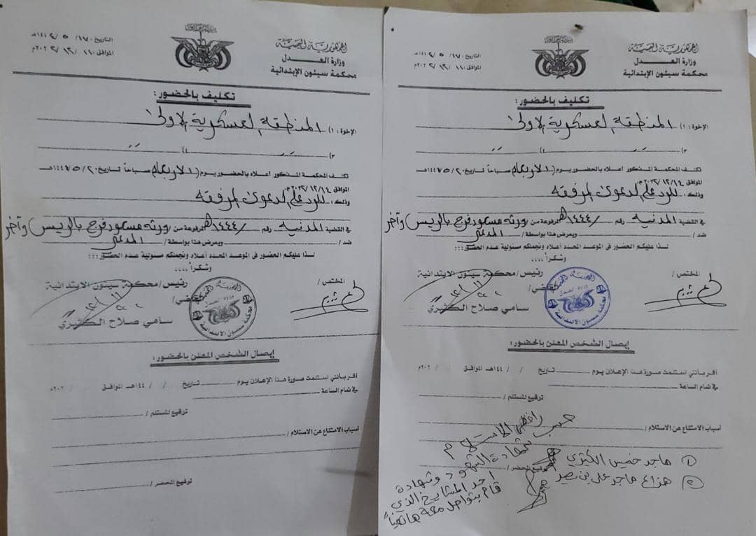 وأضافت بأنه رغم إستلام قائد المنطقة الأولى أمر الحضور من قبل عبدالله عيظة إلا إنه لم يحترم الأمر القضائي.