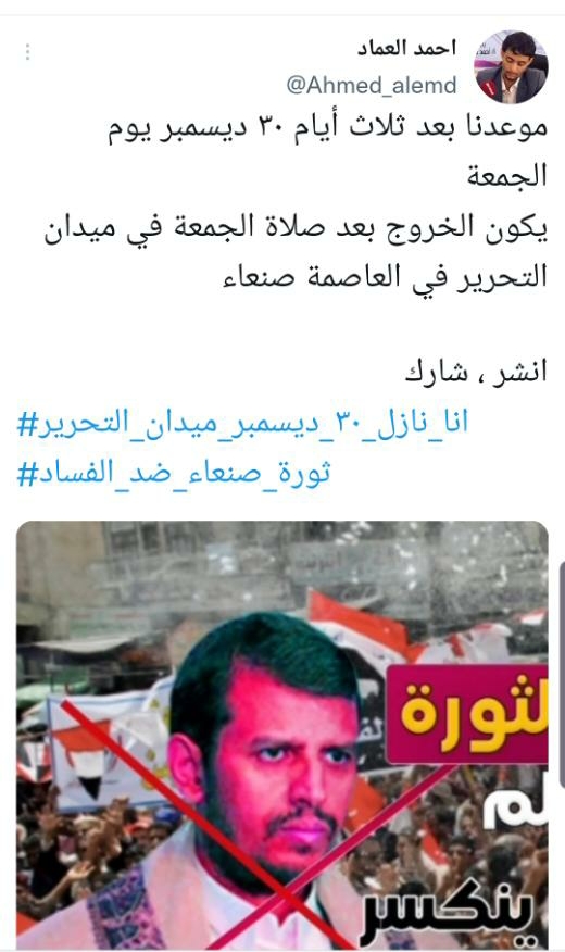 هذا واطلق ناشطون في صنعاء ومحافظة اب على وسائل التواصل الاجتماعي حملة الكترونية تحت هاشتاج #انا_نازل_30_ديسمبر_ميدان_التحرير، وهاشتاج اخر #ثورة_صنعاء_ضد_الفساد والخروج بمظاهرات حاشدة في ميدان التحرير بعد صلاة الجمعة القادمة وهو الامر الذي جعل قيادات الحوثي وانصارهم يتوعدون بقمع المتظاهرين وقتلهم في حال شاركوا بالمظاهرات بصنعاء ضد حكومتهم الحوثية الغير معترف بها دولياً .