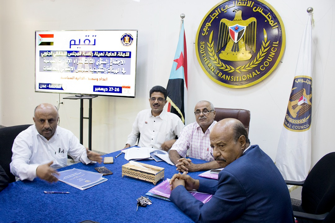 اختتمت الدائرة السياسية في الأمانة العامة لهيئة رئاسة المجلس الانتقالي الجنوبي، اليوم الثلاثاء، اجتماعها السنوي الثالث مع مديري الإدارات السياسية في الهيئات التنفيذية للقيادات المحلية للمجلس بمحافظات الجنوب.