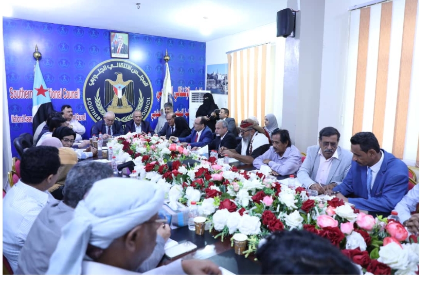 حضر الاجتماع، نزار هيثم، عضو هيئة الرئاسة للمجلس الانتقالي الجنوبي وأحمد قاسم، مدير مكتب رئيس الجمعية.