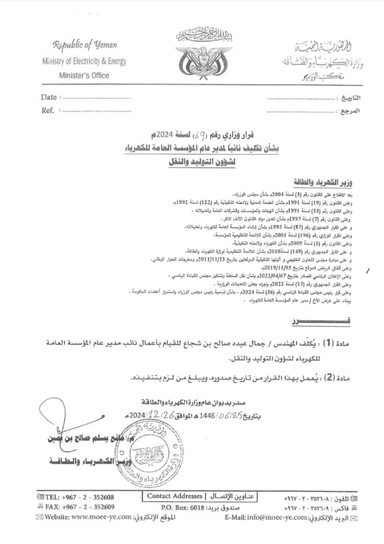 المادة (1): يُكلف المهندس جمال عبده صالح بن شجاع للقيام بأعمال نائب مدير عام المؤسسة العامة للكهرباء لشؤون التوليد والنقل.