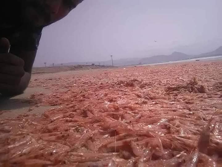 رصد مواطنون نفوق أعداد كبيرة جدا من سمك الجمبري في سواحل محافظة حضرموت الجنوبية .