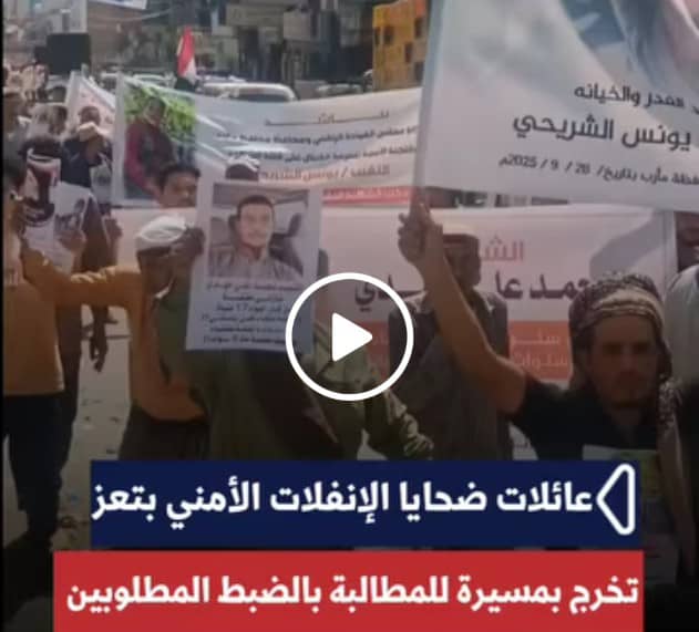 جابت شوارع تعز اليمنية اليوم مسيرة حاشدة لعائلات ضحايا الإنفلات الأمني تطالب بضبط المطلوبين أمنيًا وتحقيق العدالة لذويهم