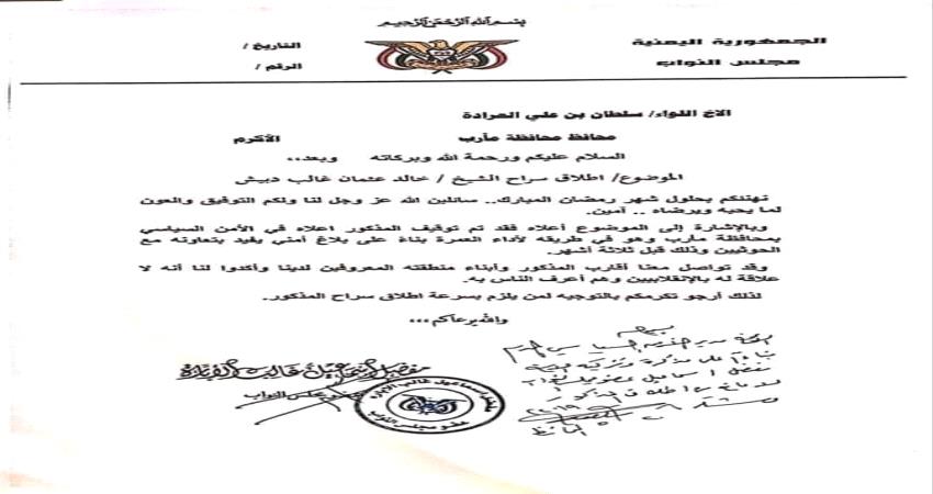 وبحسب وثيقة مرسله من عضو مجلس النواب مفضل الإبارة الى محافظ مارب سلطان العرادة طالب فيها بالأفراج عن القيادي الحوثي خالد دبيش وقال انه لم يثبت تورطه في اعمال مع المليشيات الحوثية .