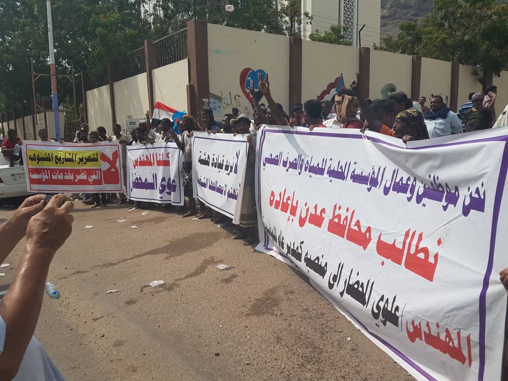نفذ موظفو المؤسسة العامة للمياه و الصرف الصحي فرع عدن وقفة احتجاجية صباح اليوم الخميس أمام مبنى المحافظة بمديرية المعلا لمطالبة محافظ عدن الأخ/أحمد سالمين بسرعة تنفيذ مطالبهم التي استمرت يومين أيام على التوالي.