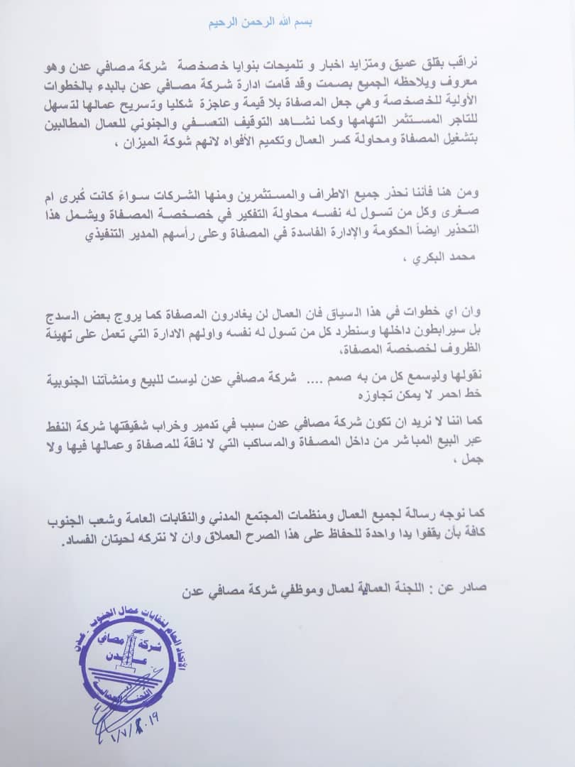 كما نوجه رسالة لجميع العمال ومنظمات المجتمع المدني والنقابات العامة وشعب الجنوب كافة بأن يقفوا يدا واحدة للحفاظ على هذا الصرح العملاق وان لا نتركه لحيتان الفساد.