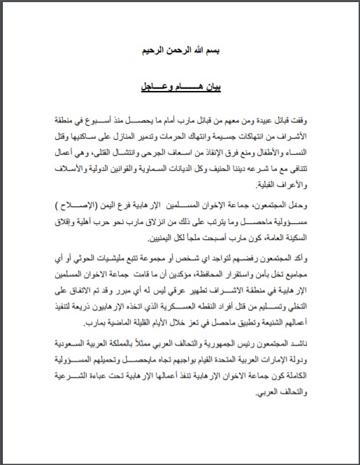بيان هام من قبائل عبيدة بمأرب يصف حزب الاصلاح بالارهابي ويتهمه بقصف المنازل فوق ساكنيها