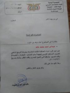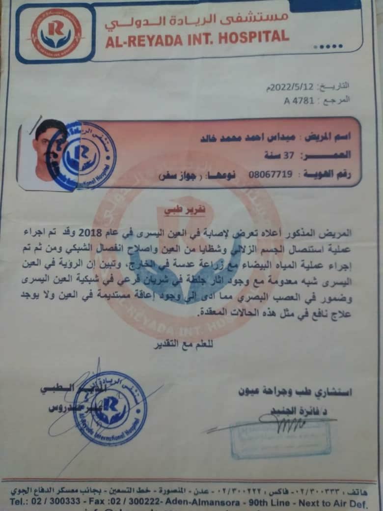 في البدء نهديكم اطيب تحياتنا وتمنياتنا لكم بالتوفيق والنجاح في مهمتكم الوطنية النبيلة في التصدي لأعداء الإسلام والمسلمين وجنوبنا الحبيب .. وبالاشارة إلى الموضوع أعلاه فإن الجندي ميداس أحمد محمد خالد أحد الملتحقين بلواء العمالقة وقد اصيب اثر عبوة ناسفة بالساحل الغربي أدت إلى إصابته في عينه اليسرى واجزاء من جسمه نتيجة