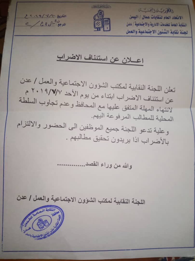اعلنت اللجنة النقابية لمكتب الشؤون الاجتماعية والعمل بالعاصمة عدن عن استئنافها الاضراب الشامل يوم غد الاحد الموافق ٧/٧ / ٢٠١٩ م .