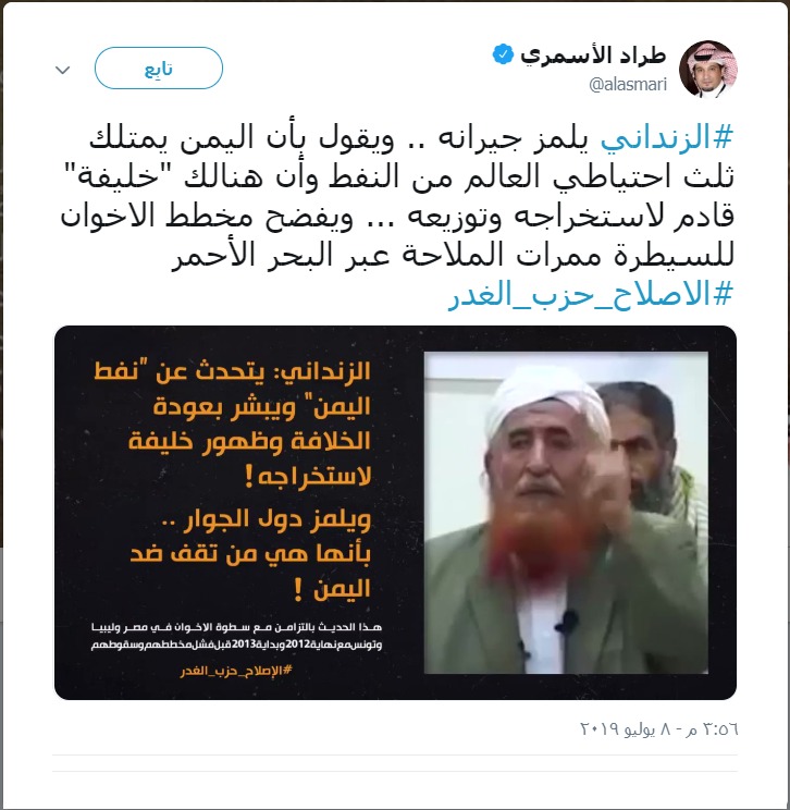 واعتبر الاسمري ان الزنداني يلمز جيرانه .. ويقول بأن اليمن يمتلك ثلث احتياطي العالم من النفط وأن هنالك “خليفة” قادم لاستخراجه وتوزيعه … ويفضح مخطط الاخوان للسيطرة ممرات الملاحة عبر البحر الأحمر.