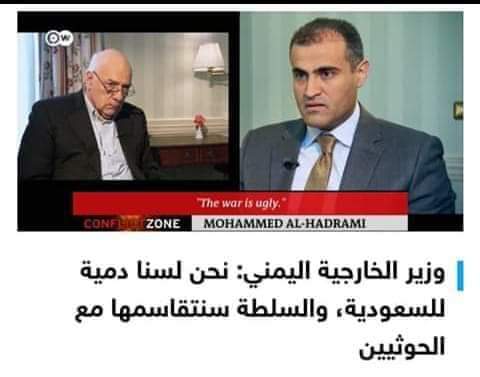 وأنه كعبدالله الحضرمي وزيرخارجية اليمن وزيدي من صنعاء يدعو الحوثيين للسلام والحوار ويعدهم أن حكومته، بالمقابل، على استعداد لاشراكهم ومقاسمتهم السلطة،خلافا للانتقالي المتمرد، ورغم تأكيده ان زعيمهم عبدالملك الحوثي يريد السلطة وحكم اليمن، بالاصطفاء، دون انتخابات ولاعتبارت دينية يرددها واتباعه.