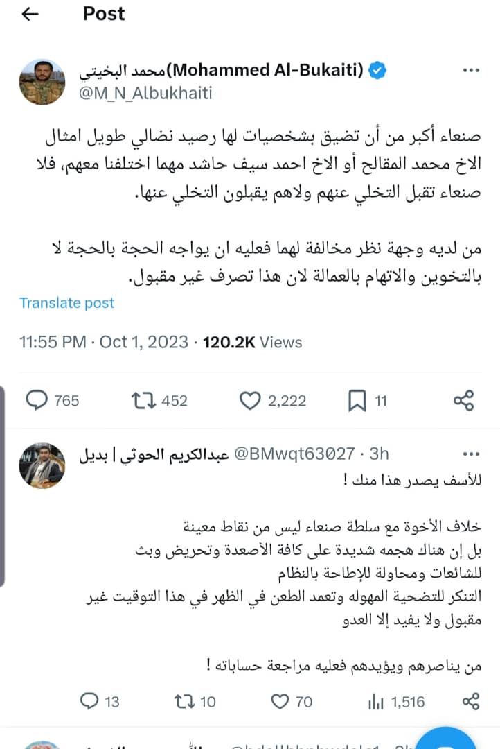واضاف البخيتي في تغريدة نشرها عبر حسابة الرسمي على منصة إكس العالمية مخاطباً قيادة الحوثي في صنعاء من لديه وجهة نظر مخالفة لهما فعليه ان يواجه الحجة بالحجة لا بالتخوين والاتهام بالعمالة مؤكداً ان ذلك تصرف غير مقبول.