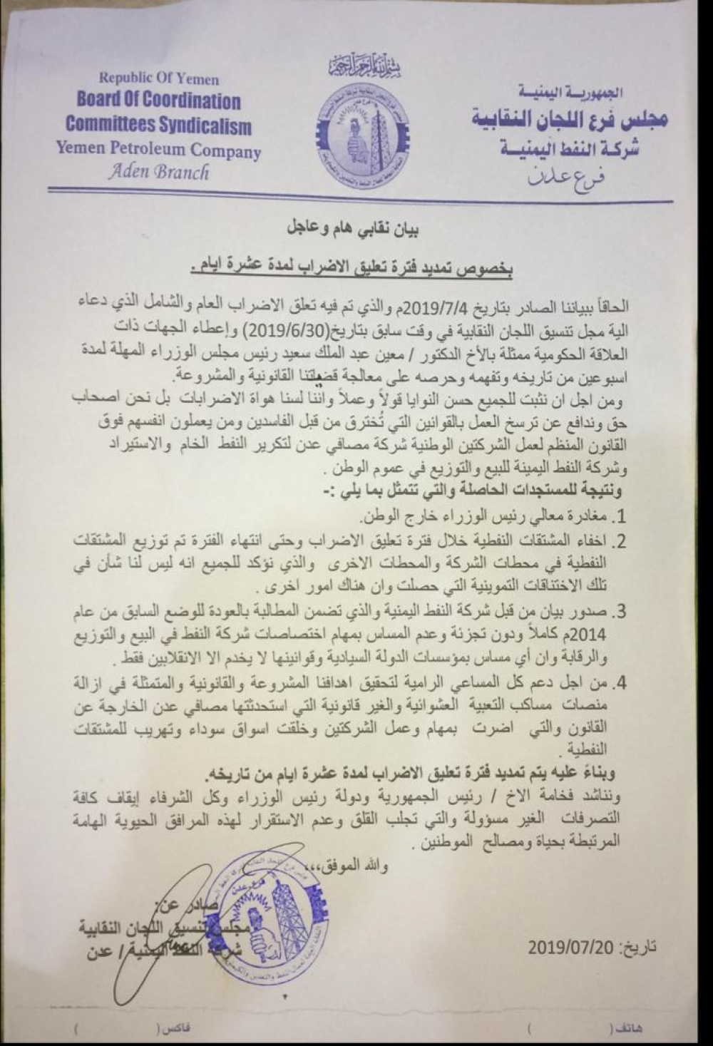 أعلن مجلس تنسيق نقابات شركة النفط اليمنية فرع عدن تمديد مدة تعليق العمل بالإضراب العام لمدة عشرة أيام.