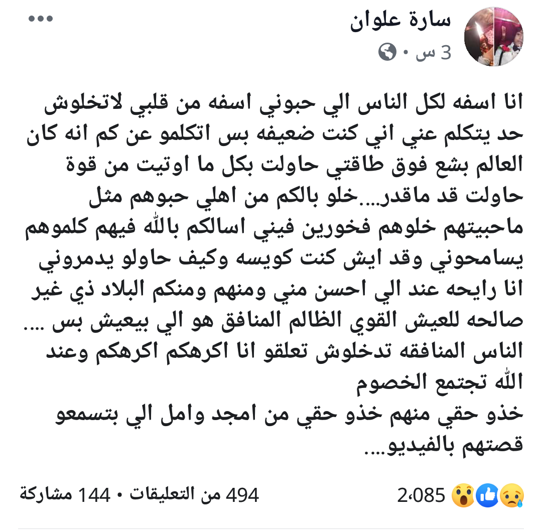 كتبت الناشطة سارة علوان في اخر منشور لها على فيسبوك قبل أن تطلق النار على نفسها ، حيث كتبت في منشورها كلمات وداع للاهلها واحبابها، كارهة المنطقة التي تعيش فيها.
