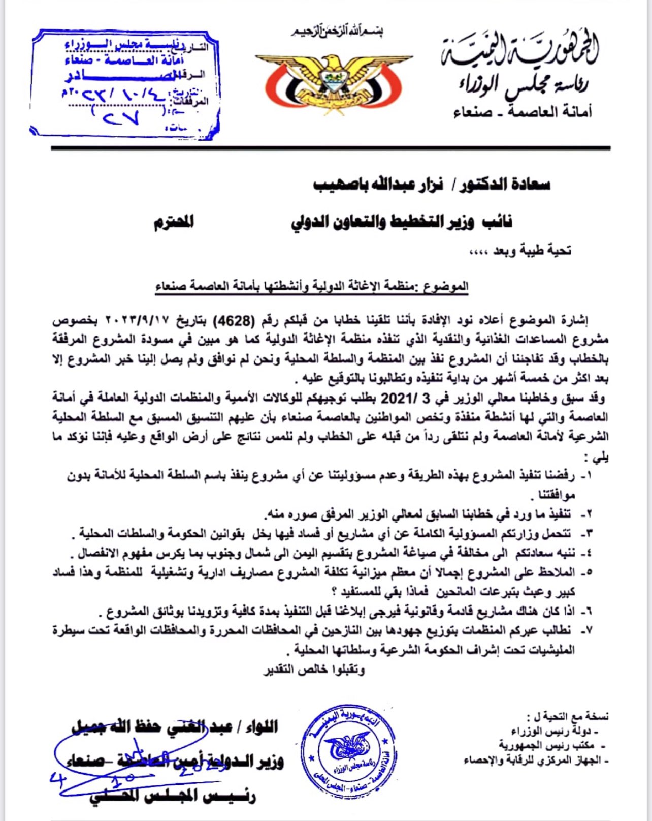 وقال اللواء جميل في تغريدة على حسابه بمنصة إكس: “تفاحأت اليوم بكارثة فساد كبيره مندوب منظمه الاغاثه الدوليه سلمني رساله من نائب وزير التخطيط يطلب مني التوقيع على اتفاقيه مسوده صرف مساعدات لنازحي امانه العاصمه بملايين الدولارات”.