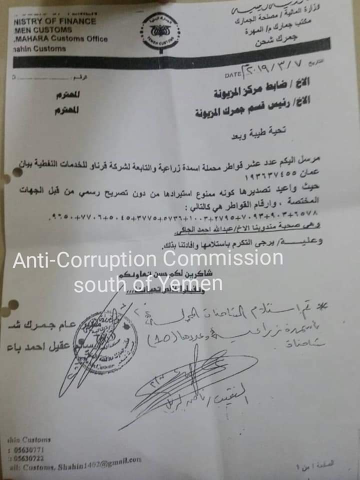 استلمت #الهيئة وثائق تؤكد إصرار الوزير المذكور إدخال شحنة لأسمدة محظورة وبدون أن أعاد المختصين في وزارة الزراعة والري عشرون الف كيس من سماد اليوريا الخاص بشركة قرناو للخدمات البترولية لصاحبها محمد ناجي الشائف صهر وزير الزراعة والري عثمان مجلي الذي صرف للشركة تصاريح بادخال ستون الف كيس سماد يوريا بطريقة مخالفة للأنظمة والقوانين باعتبار أن شركة قرناو غير مؤهله وليست مسجلة لدى الوزارة حيث انها لا تعمل في مجال الأسمدة، كما أن الأسمدة لم تدخل من بلد المنشأ والشركة ليست وكيل لشركة سابك، في الوقت الذي تم منع الوكلاء المعتمدين منذو ثلاثين عام من استيراد الأسمدة يسمح الوزير لصهره محمد ناجي الشائف بإدخال ستون الف كيس وعندما رفض المختصين في منفذ شحن إدخال الكمية لمخالفتها تم إعادة الشحنة إلى سلطنة عمان قبل حوالي ثلاثة أشهر، بعد ذلك