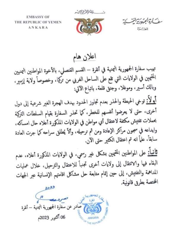 حكومة معين في دعمها للهجرة الغير شرعية.. سفارة اليمن لدى أنقرة تدعو المقيمين اليمنيين إلى مغادرة ولايات الساحل تجنباً للاعتقال والترحيل