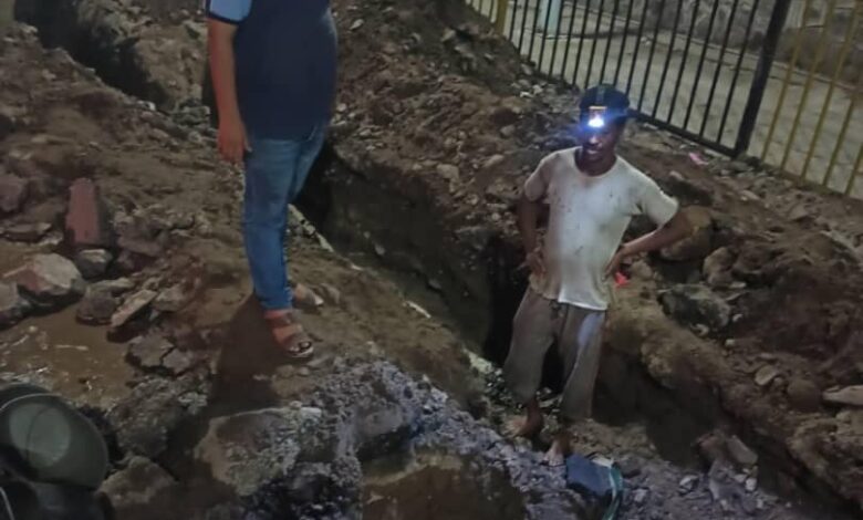 اصلاح كسر في أنبوب مياه بالعاصمة عدن.