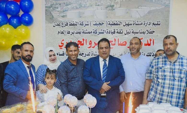 نظمت شركة النفط فرع عدن اليوم حفلا تكريما في منشأة الشهيد سهيل عوض العولقي النفطية ( منشأة حجيف – سابقاً ) لتكريم عدد (٨) من موظفي المنشأة تم ترقيتهم لدرجة رؤساء أقسام تقديراً لدورهم وجهودهم المهنية والعملية وادائهم المتميز وتفانيهم في عملهم الهادف لتحسين مستوى العمل بالمنشأة في إطار الجهود الكبيرة والمبذولة في سبيل تحسين مستوى الأداء العام في الشركة بحضور الدكتور صالح عمرو الجريري مدير عام شركة النفط بعدن .