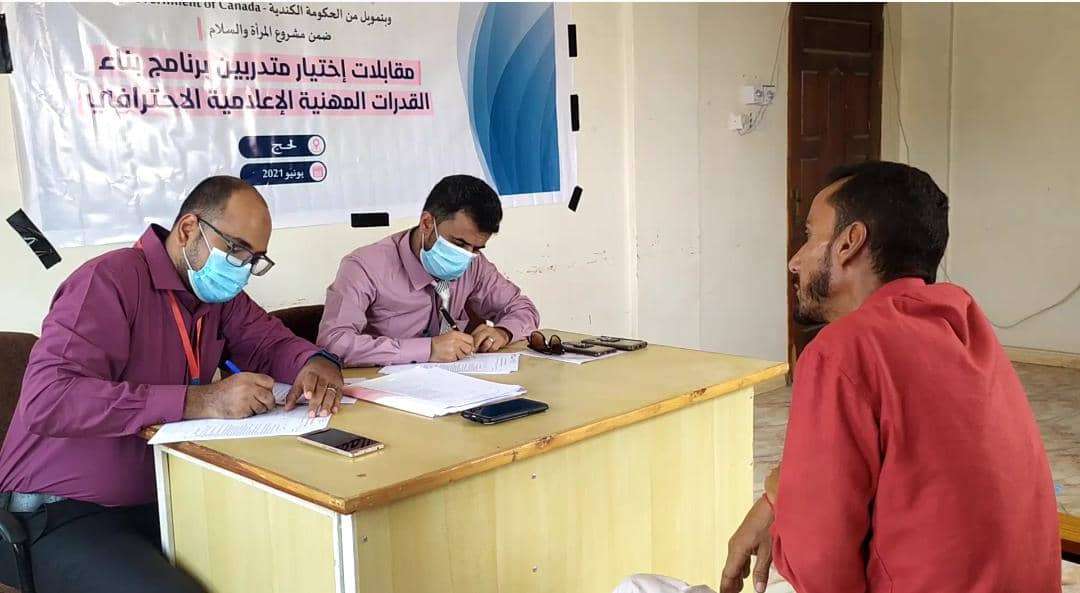 اقامت منظمة البحث عن ارضية مشتركة اليوم الاحد في محافظة لحج بالتنسيق مع مكتب اعلام محافظة لحج مقابلات اختيار متدربي برنامج بناء القدرات المهنية الاعلامية الاحترافية لاعلاميي المحافظة.