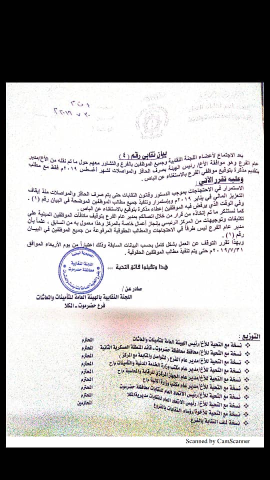 بحسب البيان رقم 4 الصادر من نقابة العمال للتأمينات والمعاشات فرع حضرموت والدي يرفض فيه طلب رئيس الهيئة بشأن استغناء العمال عن وسيلة المواصلات (الباص) من أجل صرف لهم الحافز والمواصلات .