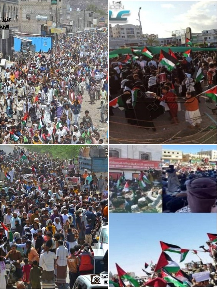 شعب الجنوب يخرج بمظاهرات عارمة في معظم محافظاتهم بعد صلاة الجمعة تضامنا مع الأشقاء في غزة وتنديدا بالمجازر التي يرتكبها العدو الصهيوني بحق شعبنا الفلسطيني في غزة وبيت المقدس وقد عبرت جماهير شعب الجنوب الثائرة عن إدانتها واستنكارها الشديدين لاستهداف المدنيين العزل وارتكاب مجازر مروعة بحق المدنيين، وحرب ابادة جماعية لشعب أعزل وفرض حصار خانق على غزة لمنع كل وسائل الإغاثة الإنسانية لمساعدة السكان الواقع تحت الحصار المطبق الظالم من منع الغذاء والدواء والوقود الضروري لتشغيل محطات تحلية المياه والكهرباء والمستشفيات .. !!