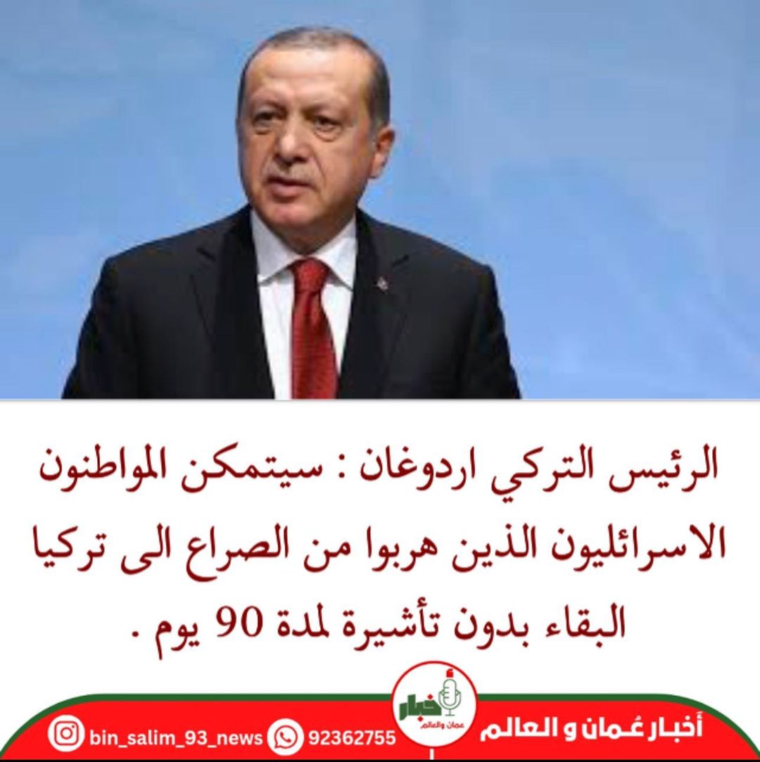 اكدت مصادر اعلامية تركية بأن الرئيس التركي« اردوغان» منح اليهود الفارين من الحرب الدائرة في فلسطين فيزاء الامن والامان دون حاجبتهم لتاشيرة دخول مختومة في جوازاتهم،