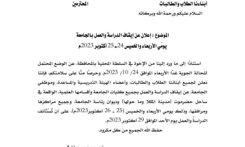 جامعة حضرموت تعلن عن إيقاف الدراسة والعمل بالجامعة يومي الأربعاء والخميس 24-25 أكتوبر 2023م