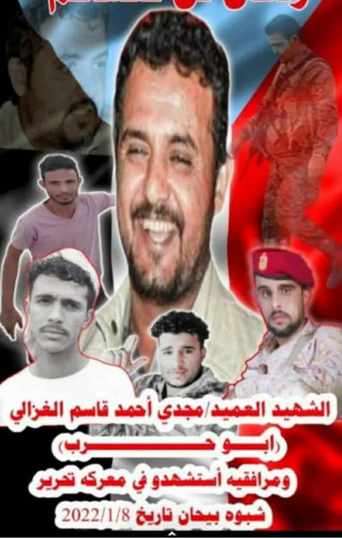 على وقع الذكرى الثالثة لإستشهاد القائد /العميد / مجدي احمد قاسم الغزالي. قائد اللواء الثالث عمالقة في جبهة بيحان محافظة شبوة الجنوبية والذي استشهد في جبهة القنذع 8_1_2022م على اثر صاروخ شيعي بحسب حكايات وروايات مازالت حتى اللحظة محل بحث واهتمام ومتابعة لواقعة الحدث ومنعطفات سير المعارك.