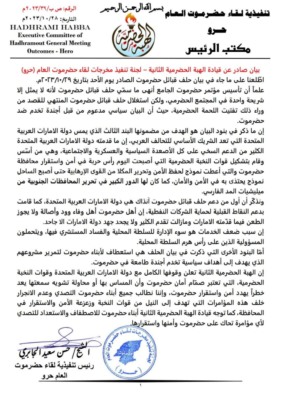 اطّلعنا على ما جاء في بيان حلف قبائل حضرموت الصادر يوم أمس الأحد بتاريخ 29/10/2023م.