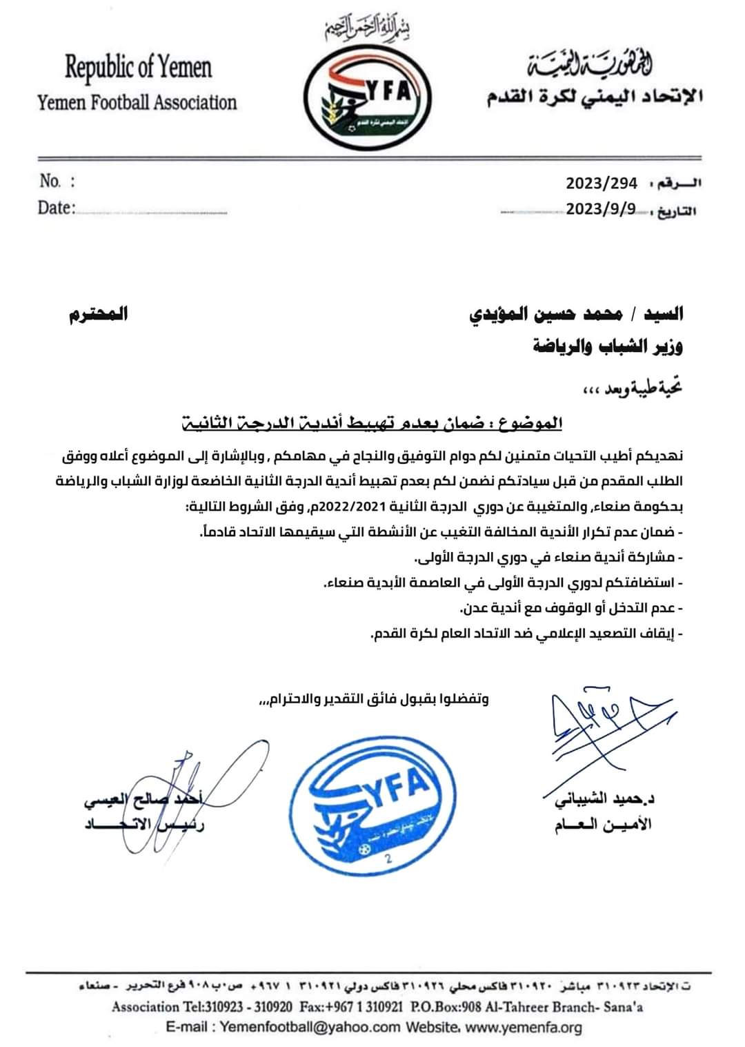 نهديكم أطيب التحيات متمنين لكم دوام التوفيق والنجاح في مهامكم , وبالإشارة إلى الموضوع أعلاه ووفق الطلب المقدم من قبل سيادتكم نضمن لكم بعدم تهبيط أندية الدرجة الثانية الخاضعة لوزارة الشباب والرياضة بحكومة صنعاء، والمتغيبة عن دوري الدرجة الثانية 2022/2021م، وفق الشروط التالية: