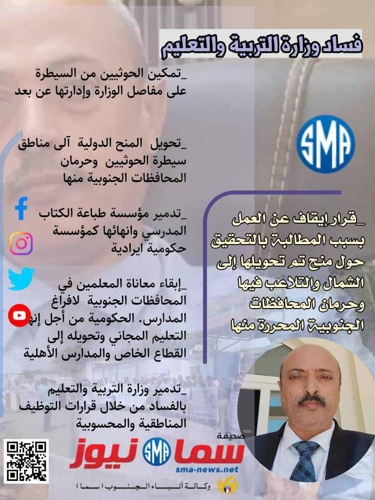 ينبغي على الوزير طارق العكبري تصحيح الاختلالات في وزارته، ينبغي عليه ايضا احالة كل المتورطين في عملية تمكين الحوثيين من السيطرة على مفاصل الوزارة وادرتها عن بعد، وكذلك تحويل المنح الدولية الى مناطق سيطرة المليشيات الرافضية الحوثية وحرمان الجنوبيين منها.