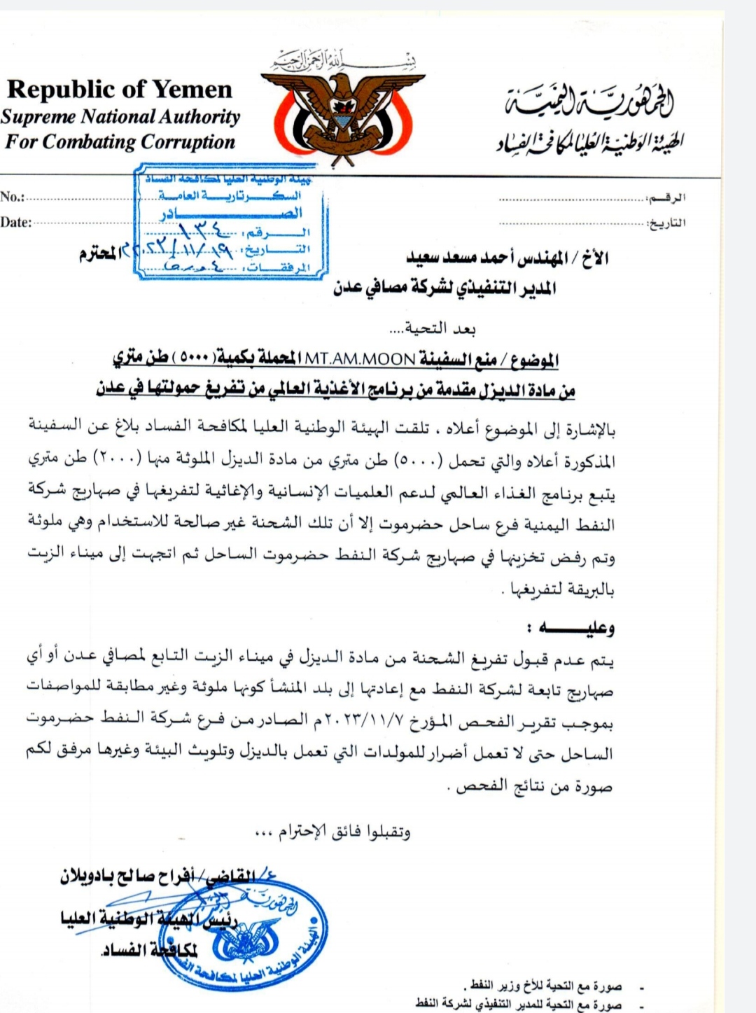 وجهت القاضية /افراح بادويلان، رئيس الهيئة الوطنية العليا لمكافحة الفساد، وجهت مذكرة رقم «134»، والمؤرخة 19/11/2023م للمهندس/احمد مسعدسعيد، المدير التنفيذي لمصافي عدن، والمتضمنة عدم قبول تفريغ السفينة (mt, amamoon)، المحملة بكمية «5000» طن متري من مادة الديزل، مقدمة من برنامج الاغذية العالمي من تفريغ حمولتها في عدن