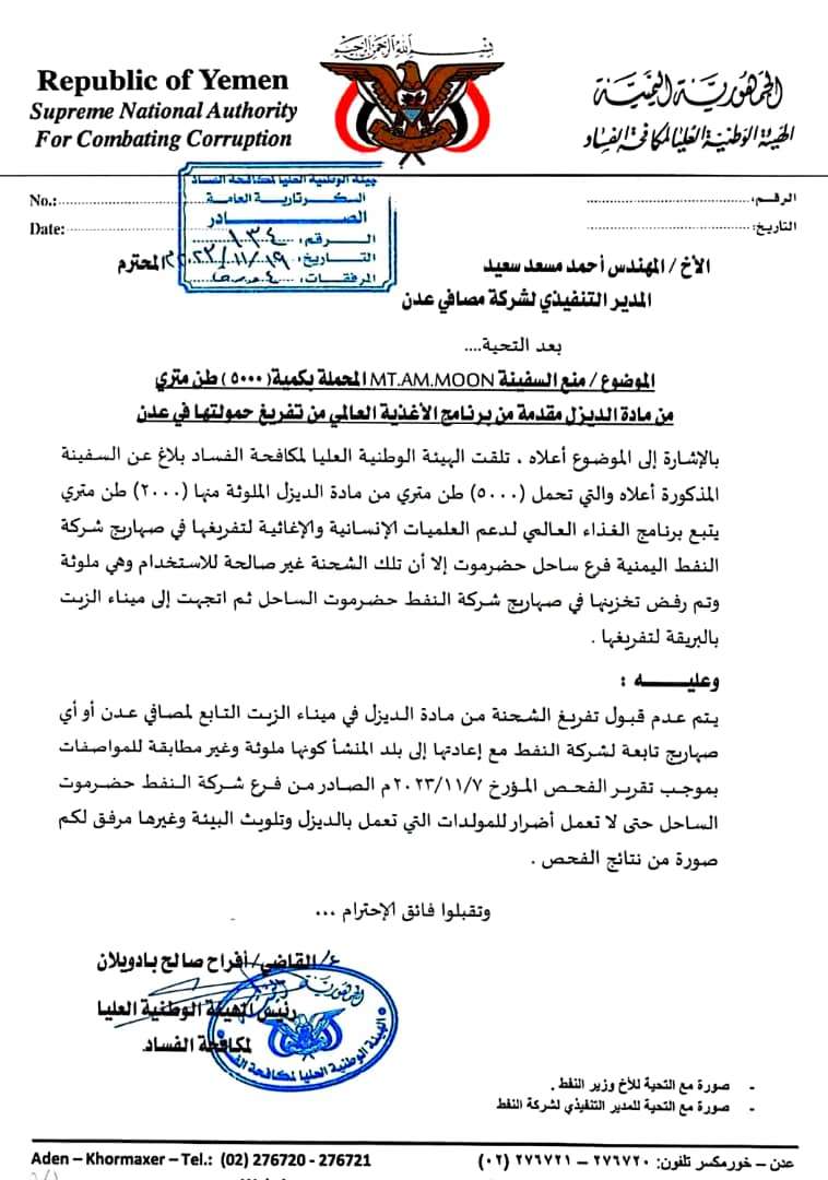 حذرت الهيئة الوطنية العليا لمكافحة الفساد القاضي أفراح صالح بادويلان في مذكرة رسمية وجهتها إلى المدير التنفيذي لشركة مصافي عدن أحمد مسعد سعيد من قبول شحنة 5000 طن متري من مادة الديزل على متن السفينة MT.AM.MOON مقدمة من برنامج الأغذية العالمي ومنعها من تفريغ حمولتها في ميناء مصافي العاصمة عدن.