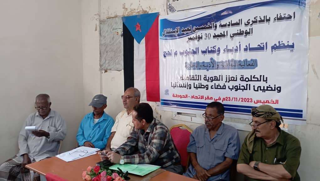 نظم اتحاد أدباء وكتاب الجنوب بمحافظة لحج امس الخميس فعالية ثقافية أدبية تحت عنوان “بالكلمة نعزز الهوية الثقافية ونضيىء الجنوب فضاء وطنياً وانسانياً” احتفاءً بالذكرى الـ 56 لعيد الاستقلال الوطني المجيد الـ 30 من نوفمبر.
